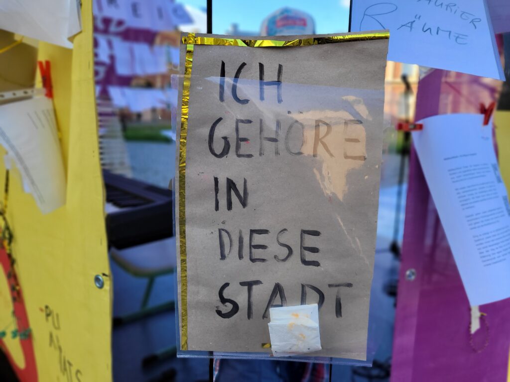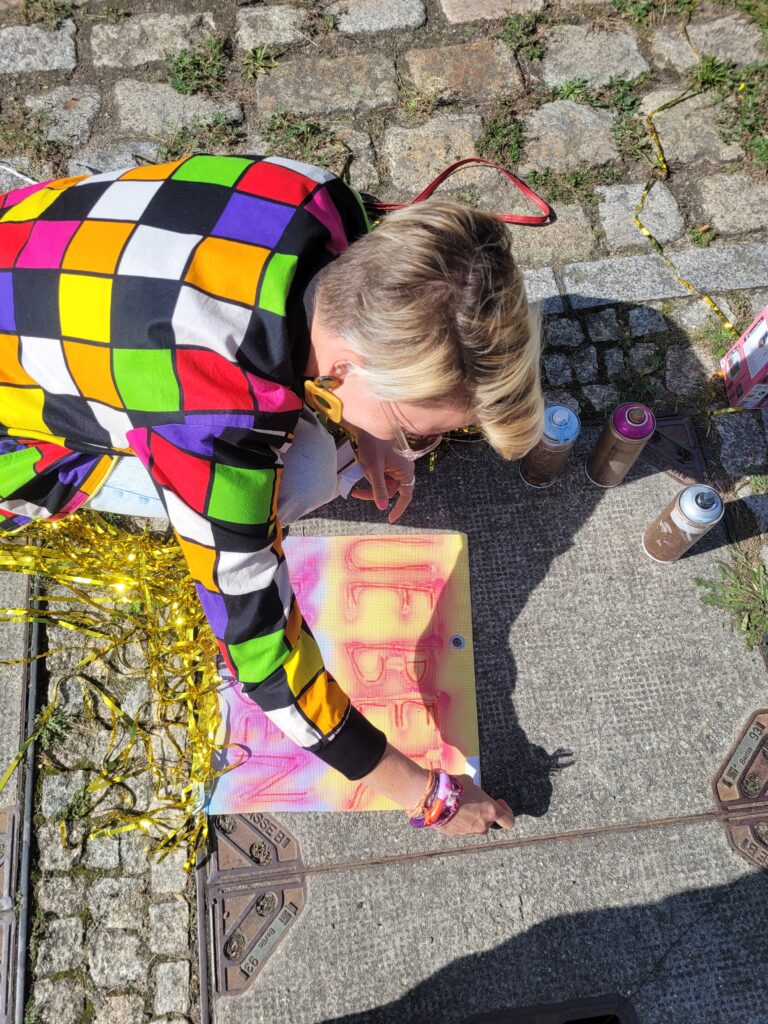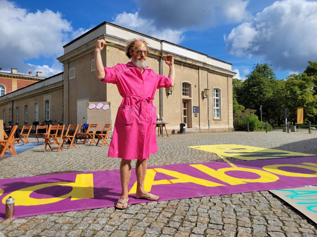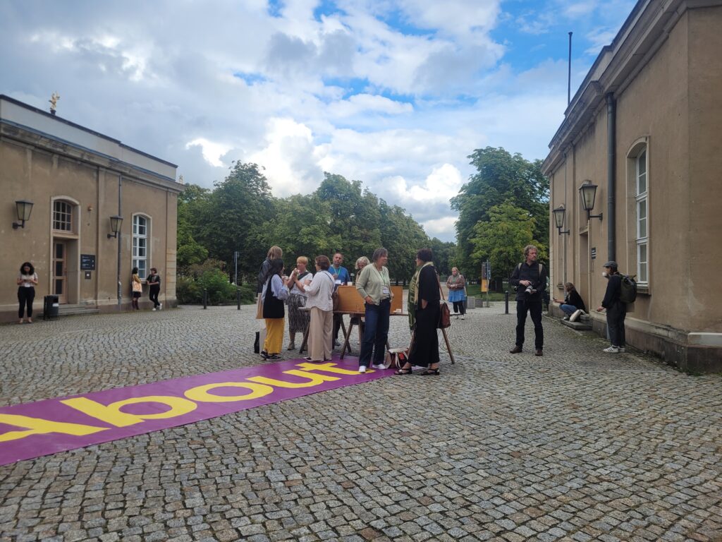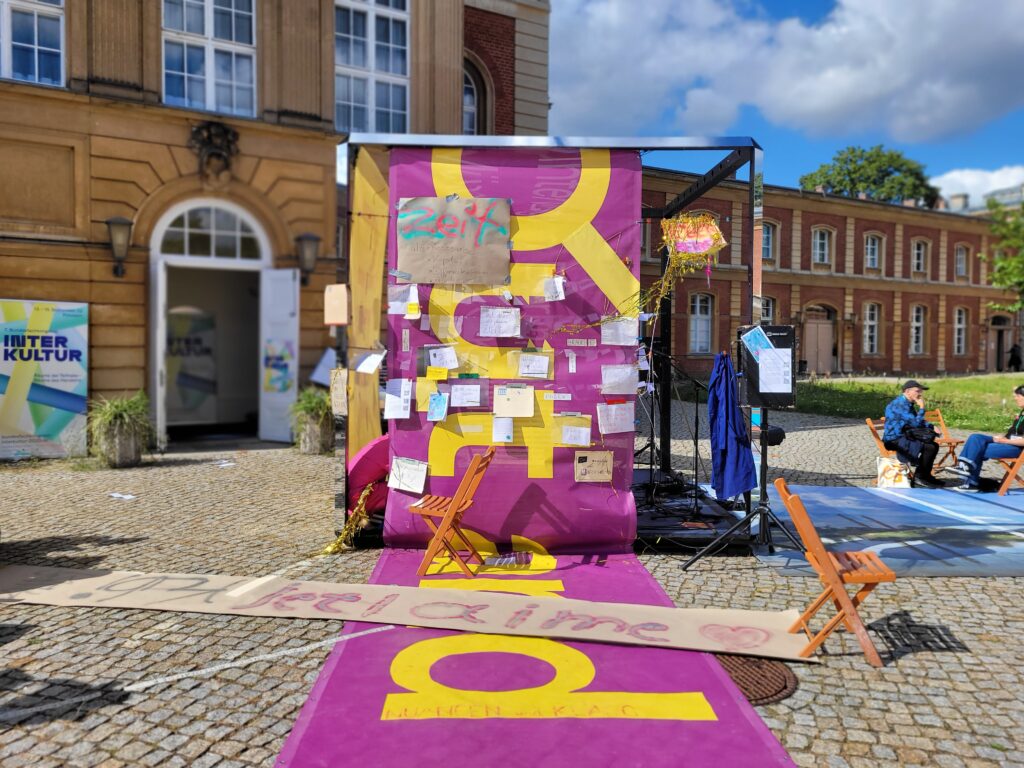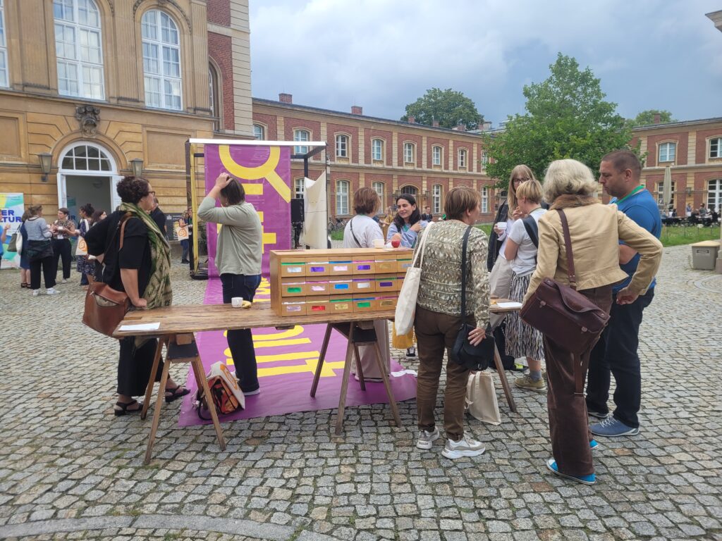 Wir luden vom 13. – 15. September 2023 auf dem Campus der Universität Potsdam, im öffentlichen Raum, ein Publikum und Nicht-Publikum ein, Ideen, Reaktionen, Eindrücke, Fragen, Wünsche und Visionen im Kongressverlauf digital zu teilen und zu dokumentieren – denn die inter □ skulptur war/ist lebendiges Kongressarchiv und offenes Forum für performative, verbale, lyrische, digitale Beiträge aller zugleich. Alle wohnten dem Entstehen eines multiperspektivischen FREIRAUMS bei. Sie besuchten uns jeden Tag. Sie hörten Beiträge auf unserer Bühne/ in unserer Installation: Festival für Freunde, RZ Potsdam, Netzwerk Junge Ohren, Interkulturelles Forum Hamburg, Fluctoplasma Festival Hamburg, Hummustopia NRW und weitere. Sie kamen miteinander ins Gespräch. Sie ruhten ich aus. Sie luden selbst ein dabei zu sein.